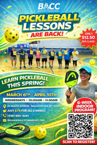If you are ready to try Pickleball in a fun, small-class environment, then join us at the BACC for the Intro to Pickleball class. Bring your racket and wear comfortable clothes and sneakers. Class Dates: Fridays, 03/06 – 04/10 Time: 10:00AM – 11:30AM Cost: $75 per participant Location: Class takes place in BACC’s gymnasium, located at 20 Malta Ave., Ballston Spa, NY